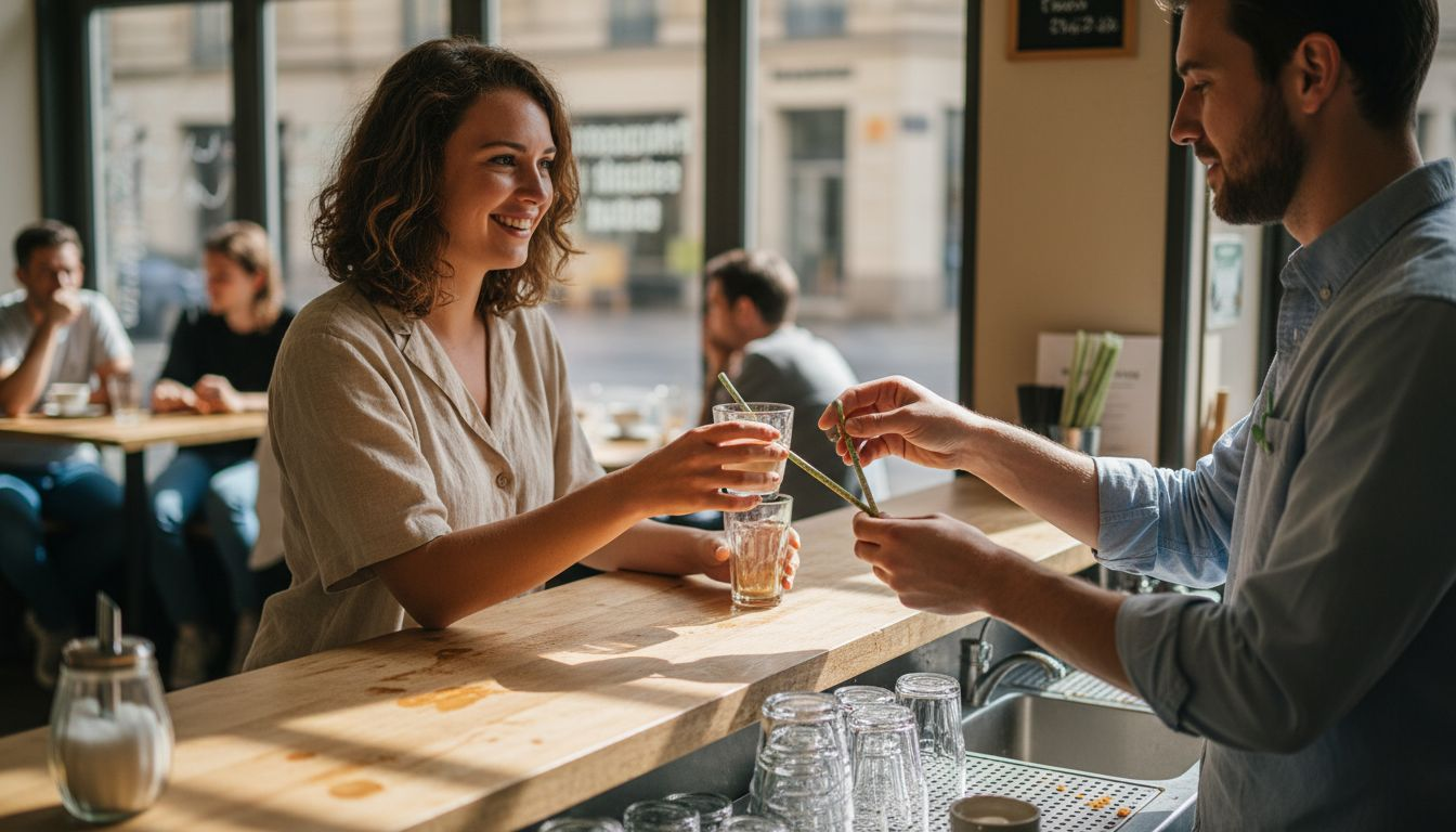 Strategie één: visuele signalering. Plaats kleine bordjes bij dranken: “Plantaardige rietjes beschikbaar”. Dit simpele bericht verhoogt bewustzijn direct. Gasten voelen zich geïnformeerd en gewaardeerd.